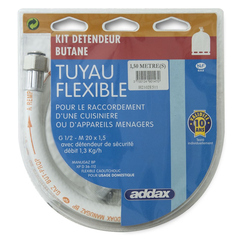 Le kit flexible + détendeur butane Manugaz d'Addax est une solution complète et sécurisée pour raccorder votre appareil à gaz butane en toute sérénité. Conditionné en blister pratique, ce kit regroupe en un seul achat les deux éléments essentiels d'une installation gaz domestique conforme et homologuée.
