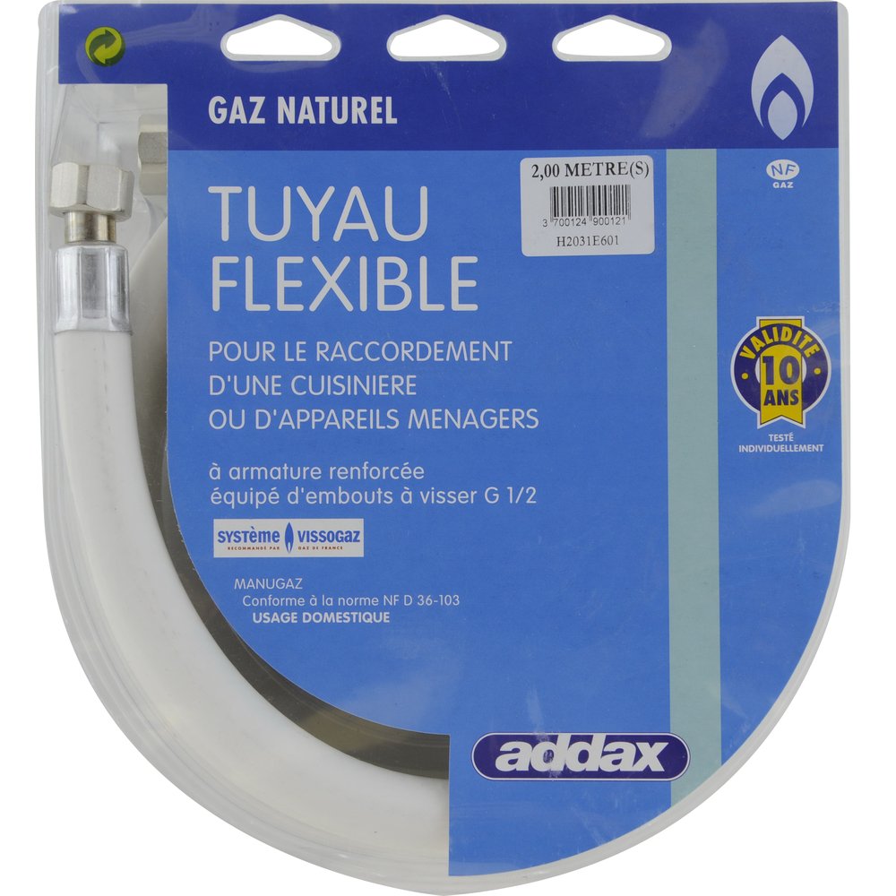 Chez Brikoleur, vous trouverez ce flexible ADDAX MANUGAZ en différentes longueurs pour répondre à toutes les configurations d'installation. Pensez à conserver l'emballage d'origine qui mentionne la date de fabrication et l'échéance des 10 ans de validité, et n'oubliez pas de tester l'étanchéité avant toute mise en service.