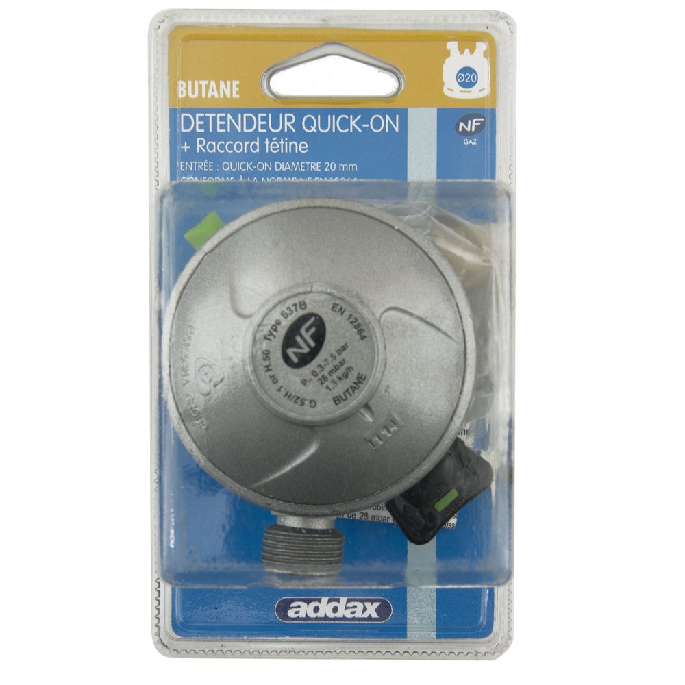 Avant d'acheter ce détendeur QUICK-ON, assurez-vous que votre bouteille est bien équipée d'une valve automatique de diamètre Ø20 mm (bouteilles ELFI, MALICE ou TWINY de 6 ou 10 kg). Pour les bouteilles CUBE et VISEO de Butagaz équipées d'une valve Ø27 mm, une autre référence ADDAX est disponible chez Brikoleur.
