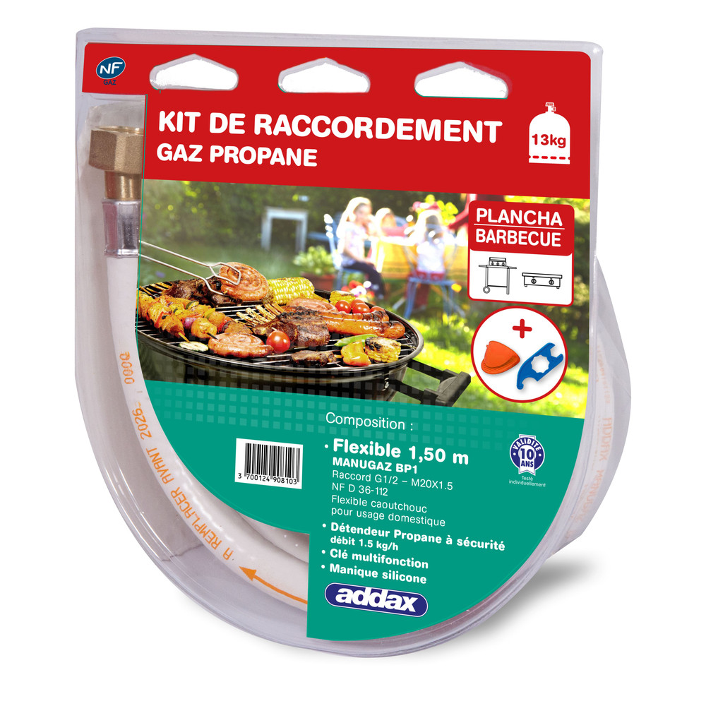 Le kit de raccordement propane ADDAX est la solution complète et sécurisée pour connecter votre barbecue ou plancha à gaz en toute sérénité. Pensé pour les utilisateurs soucieux de sécurité comme de praticité, ce kit rassemble tous les éléments nécessaires au raccordement d'appareils fonctionnant au gaz propane, dans le respect des normes en vigueur.