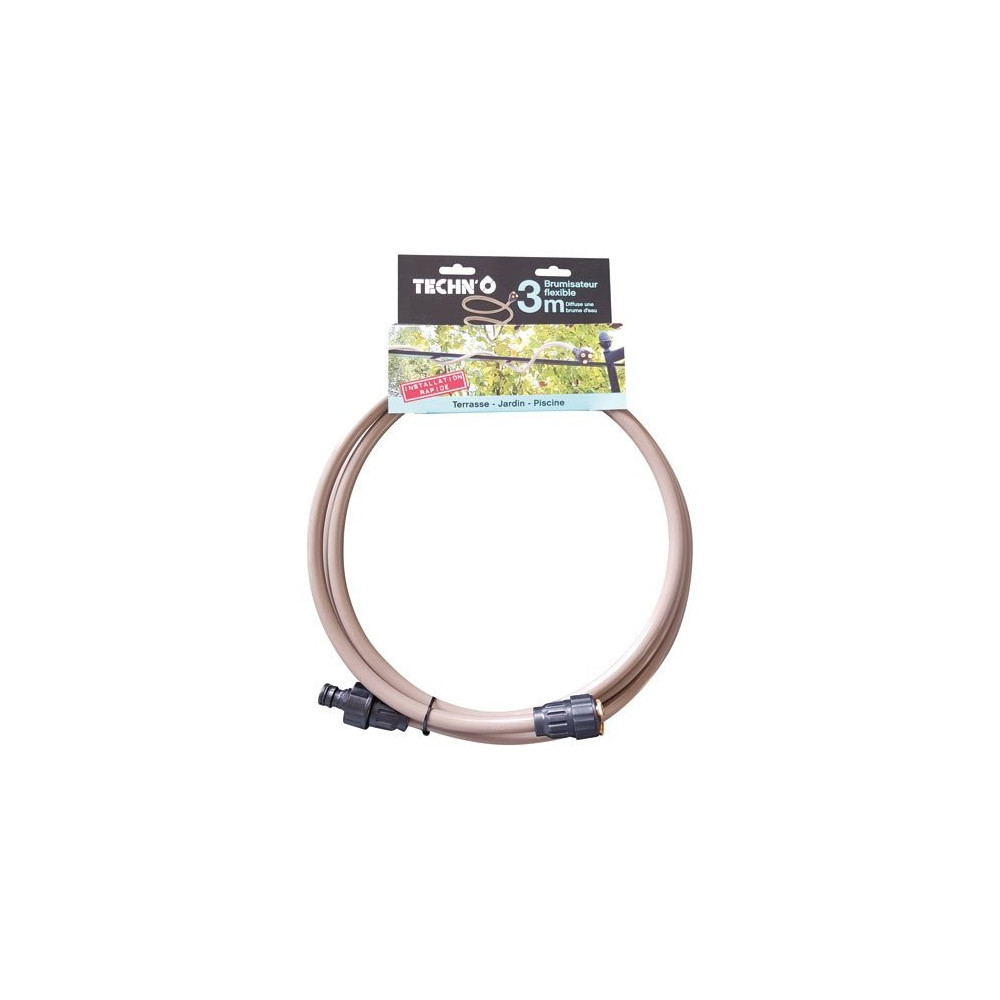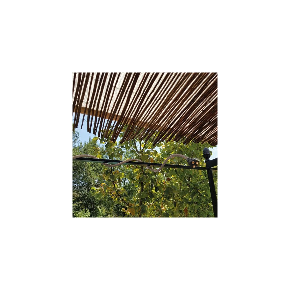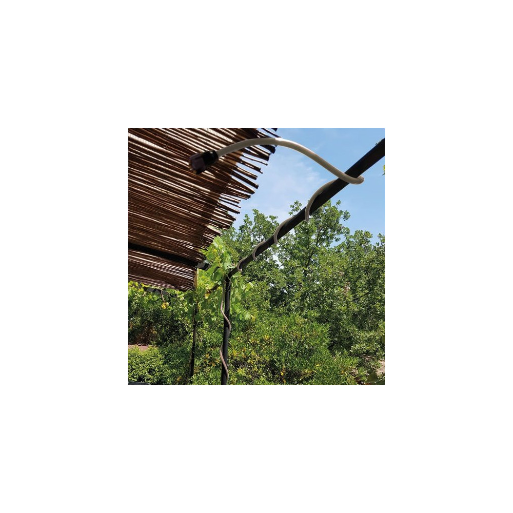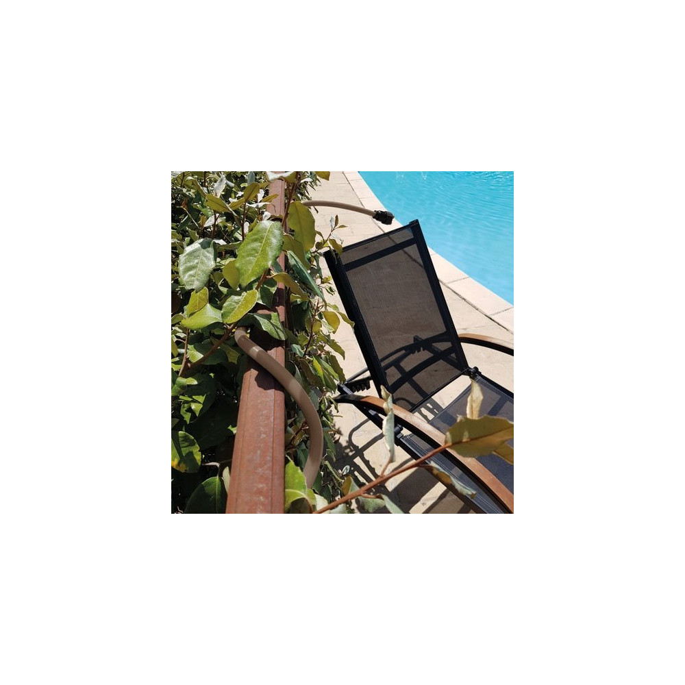 Avec son tuyau à mémoire de forme de 3 mètres, ce brumisateur s'adapte à toutes les configurations de support : pergola, brise-vue, garde-corps, parasol ou treille. Sa grande flexibilité permet de le positionner précisément pour orienter les buses là où vous en avez besoin. Le branchement s'effectue directement sur votre tuyau d'arrosage existant, sans outil ni plombier — le système est livré prêt à l'emploi.