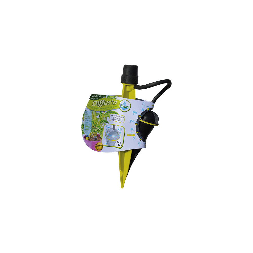 Finie la corvée d'arrosage ! | Grâce à ce goutteur, ne laissez plus mourir vos plantes par manque d’eau. | Posez ce goutteur et soyez débarrassé de la mission d’arrosage pendant près de 30 jours. | | Les goutteurs offrent une régulation précise de l'arrosage en goutte à goutte grâce à une molette numérotée de 1 à 11. | Son goutteur déporté permet un positionnement optimal près de la plante et facilite le remplissage. | Le goutteur Diffus'o sur pied IRISO, récompensé par un brevet et une médaille