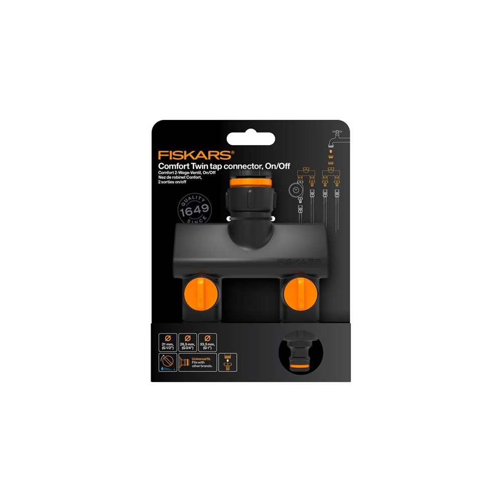 Optimisez votre installation d'arrosage avec le Connecteur Vanne 2 Voies Fiskars Confort Marche/Arrêt. Ce raccord de robinet ingénieux permet de brancher simultanément deux tuyaux d'arrosage distincts sur une seule source d'eau, tout en conservant un contrôle individuel et indépendant sur chacun d'eux.