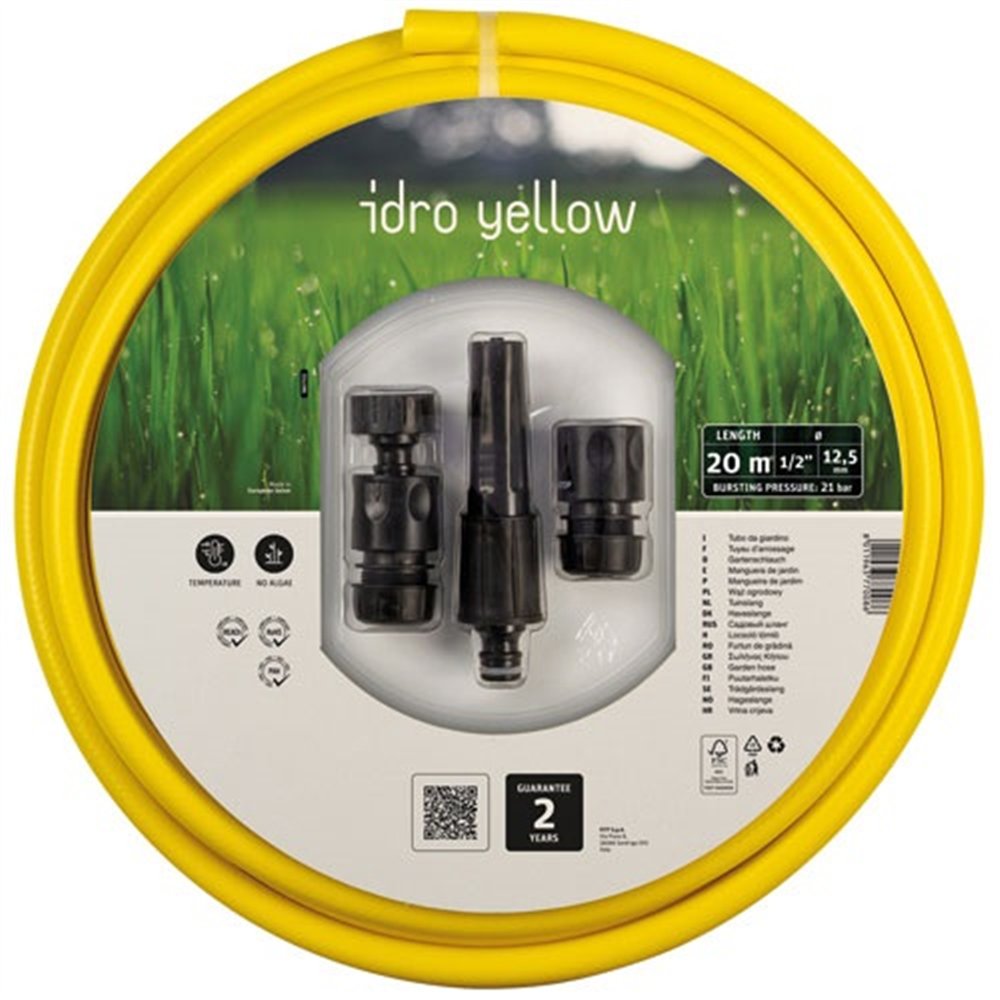 Ce kit FITT Idro jaune Ø 12,5 mm x 20 m est livré avec un set de raccords plastique et une lance pour débuter l'arrosage immédiatement après déballage. Il résiste à des températures allant de -10°C à +40°C, ce qui lui permet d'être utilisé dans des conditions climatiques variées, de l'hiver au plein été. La garantie fabricant de 2 ans confirme la qualité et la fiabilité de cette référence FITT.