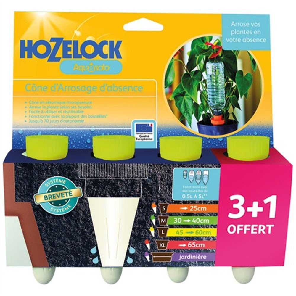 Facile à ranger hors saison, lavable à l'eau claire, ce lot de 4 cônes jaunes HOZELOCK est un investissement minimal pour des plantes toujours en bonne santé. Idéal pour les plantes d'appartement, les herbes aromatiques sur rebord de fenêtre ou les fleurs de balcon. Humidifiez bien la terre avant de partir pour maximiser l'autonomie du système.