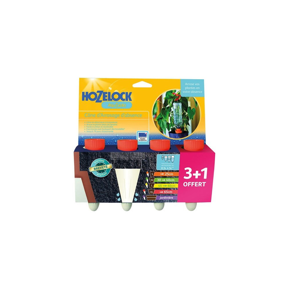 Partez en vacances l'esprit tranquille grâce aux cônes d'arrosage Aquasolo en céramique orange de Hozelock. Ce lot de 4 cônes constitue une solution d'arrosage automatique ingénieuse et économique, idéale pour maintenir vos plantes en pot bien hydratées pendant votre absence, jusqu'à 28 jours consécutifs selon la taille du pot et du cône utilisé.