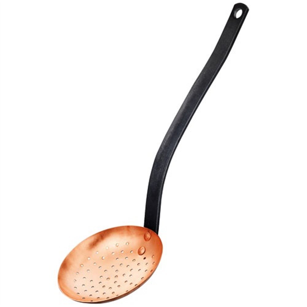 Cette écumoire de 11 cm excelle pour écumer les bouillons, récupérer les gnocchis ou les quenelles à la surface de l'eau, retirer les beignets ou les légumes frits, ou encore filtrer les confitures en cours de cuisson. Le cuivre massif, matériau de choix des grandes cuisines, offre une résistance à la chaleur et une durabilité bien supérieures aux modèles en acier inoxydable bas de gamme. Une pièce qui se transmet de génération en génération.