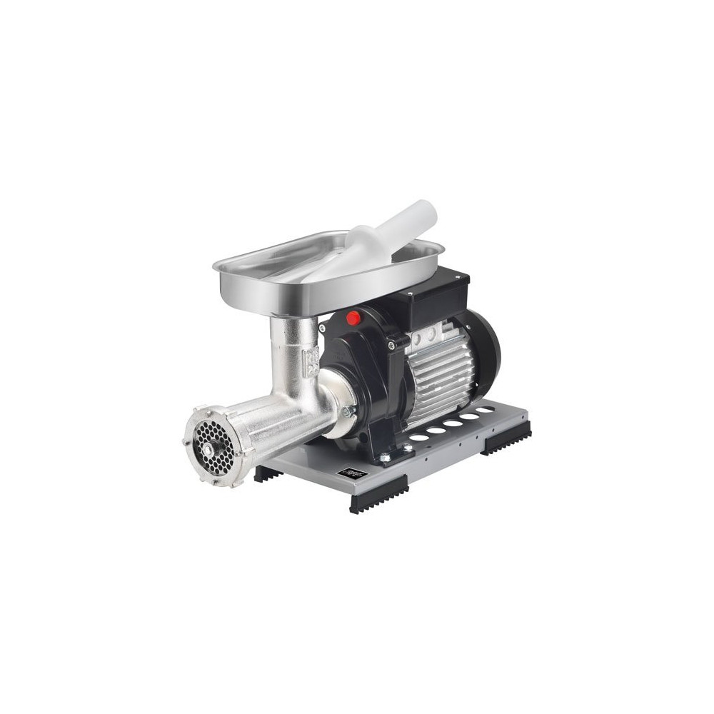 Hachoir à viande électrique N°22 - Capacité 80 à 120 kg de viande /heure - Fourni avec une grille diamètre 8 mm, plateau inox et pilon - Moteur monophasé à induction et service continu - Puissance 600 W - Garantie 2 ans - Fabriqué en Italie.
