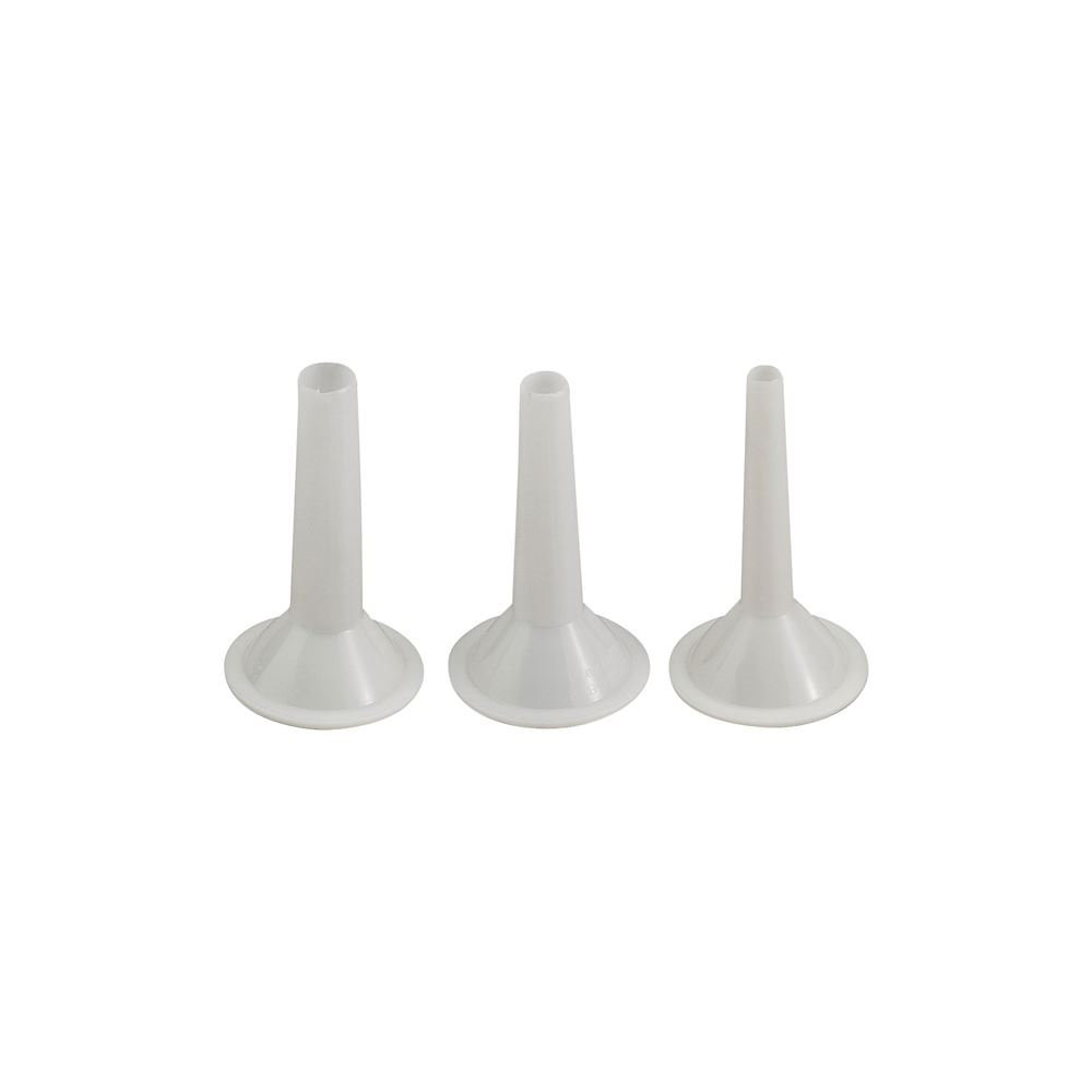 Le lot comprend trois entonnoirs aux diamètres de 15 mm, 20 mm et 25 mm, couvrant ainsi l'essentiel des besoins en charcuterie artisanale maison. Conçus spécifiquement pour s'adapter aux hachoirs à viande manuels Reber de taille N°5, ils s'installent et se retirent rapidement sans outil. Leur forme évasée facilite le passage de la farce sans bourrage.