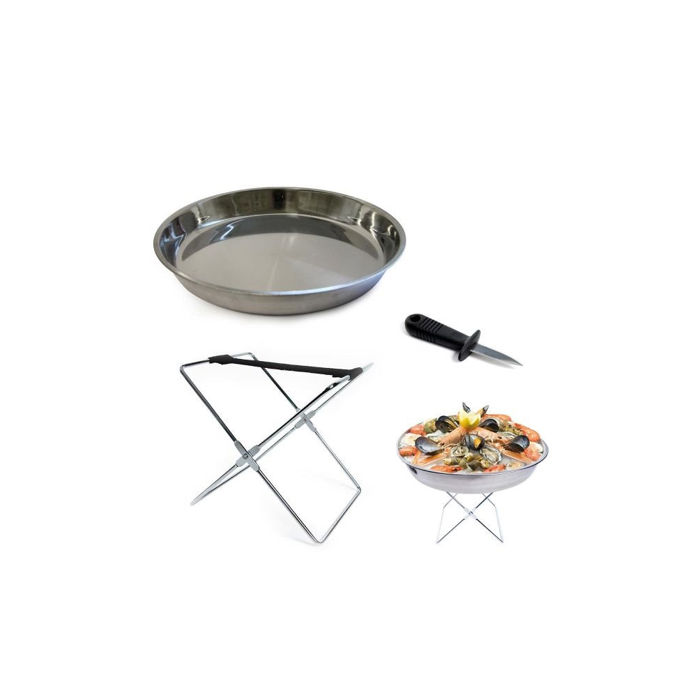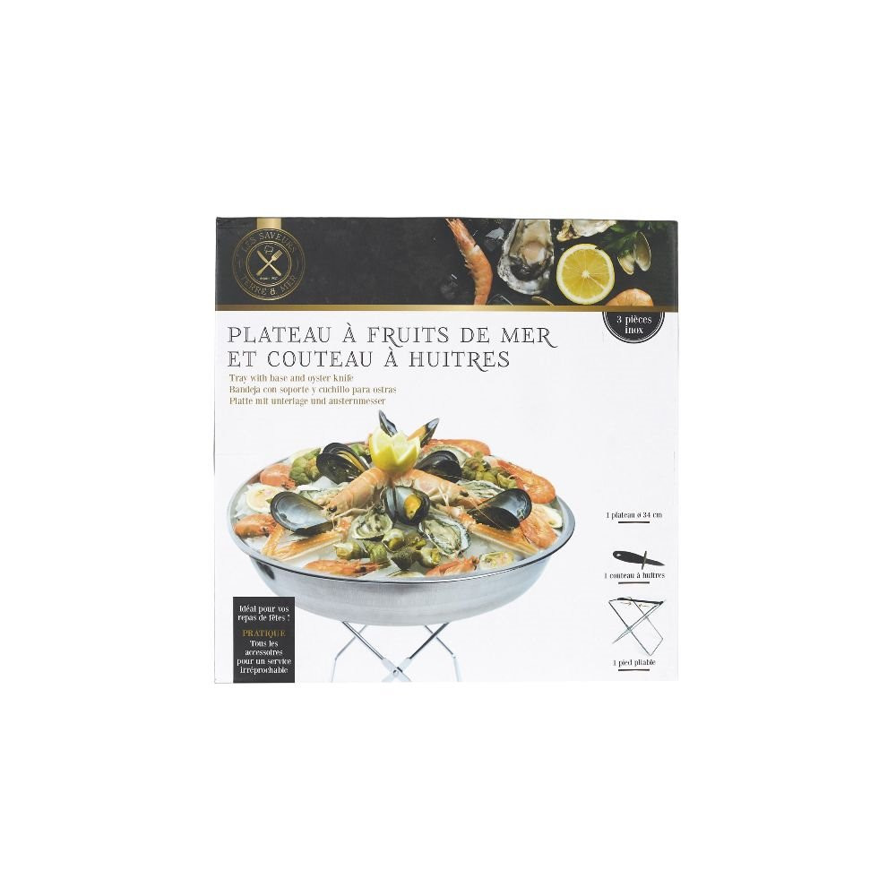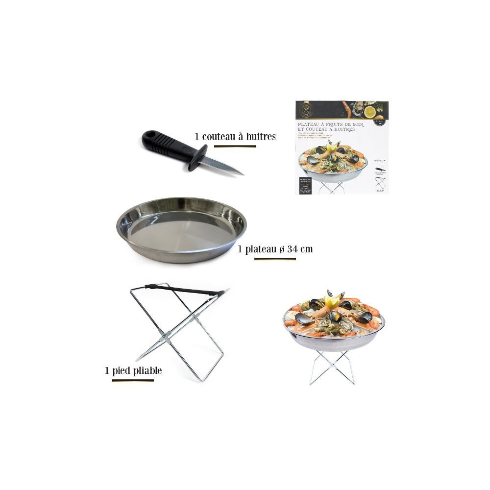 Le support pliable est particulièrement pratique : il permet de stabiliser le plateau en hauteur, libérant de l'espace sur la table et facilitant le service pour tous les convives. Le couteau à huîtres, élément essentiel de ce type d'occasion, permet d'ouvrir les coquillages sans risque de glissement ni de blessure.