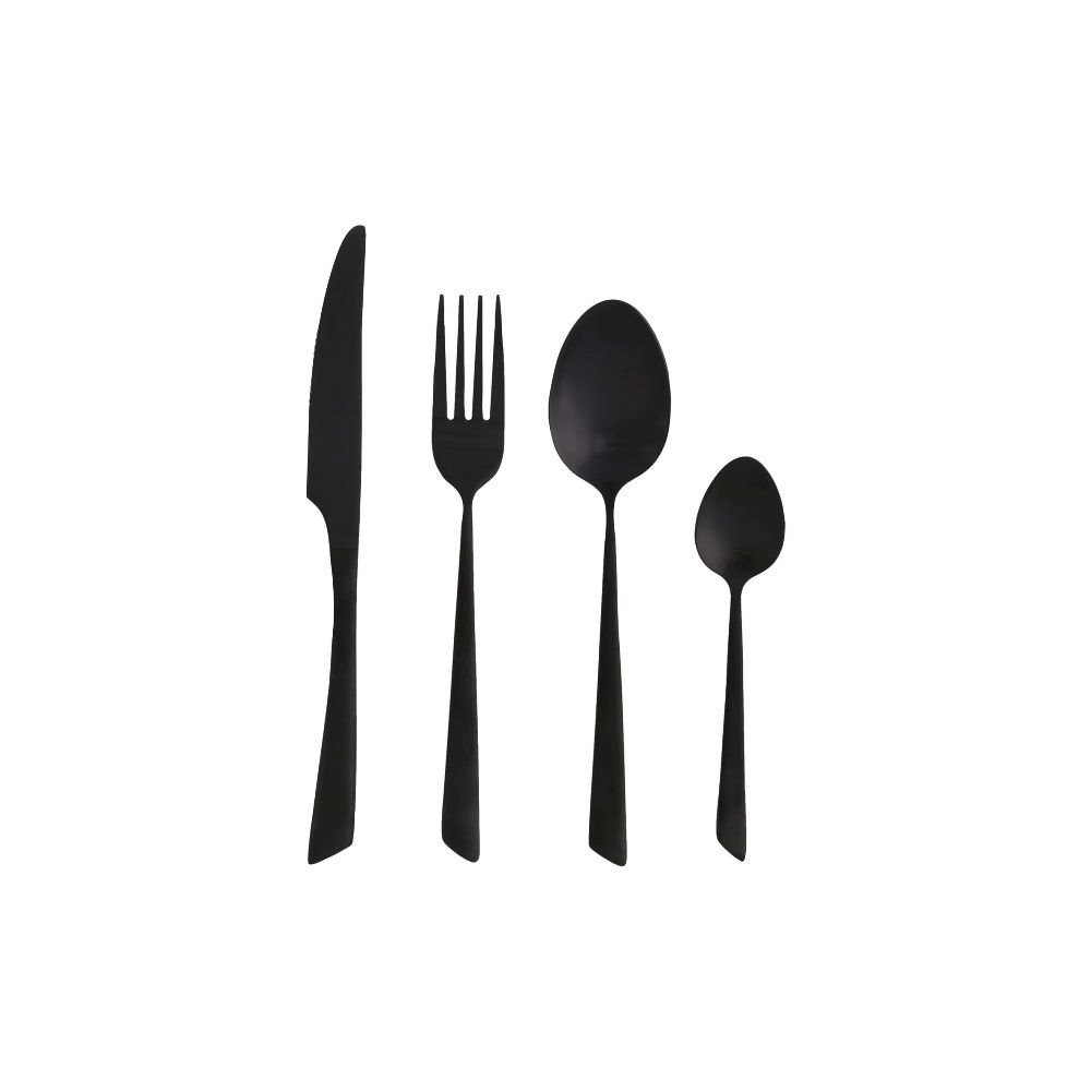 Ménagère 16 pièces - Delta Black - Chics, élégants et tendances, ces couverts originaux sont parfaits pour une table moderne ! - A associer avec de la vaisselle blanche pour créer une table en Noir & Blanc - Ménagère composée de 4 couteaux monoblocs, 4 fourchettes, 4 cuillères de table et 4 cuillères à café - En acier inoxydable avec revêtement noir mat - Épaisseur : cuillère de table et fourchette 3 mm, cuillère à café 2.5 mm - Couteau monobloc avec lame micro-dentée - Couverts monobloc - Netto