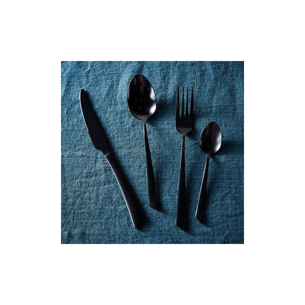 Le service se compose de 4 couteaux monoblocs, 4 fourchettes, 4 cuillères de table et 4 cuillères à café, pour une tablée de 4 personnes. La finition black est obtenue par un traitement de surface durable qui résiste aux chocs et aux égratignures du quotidien. L'association recommandée avec de la vaisselle blanche crée un contraste Noir & Blanc saisissant, très recherché dans la décoration de table actuelle.