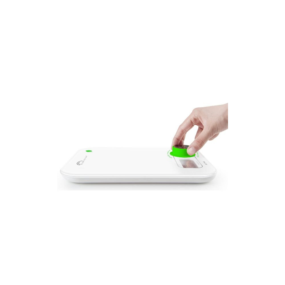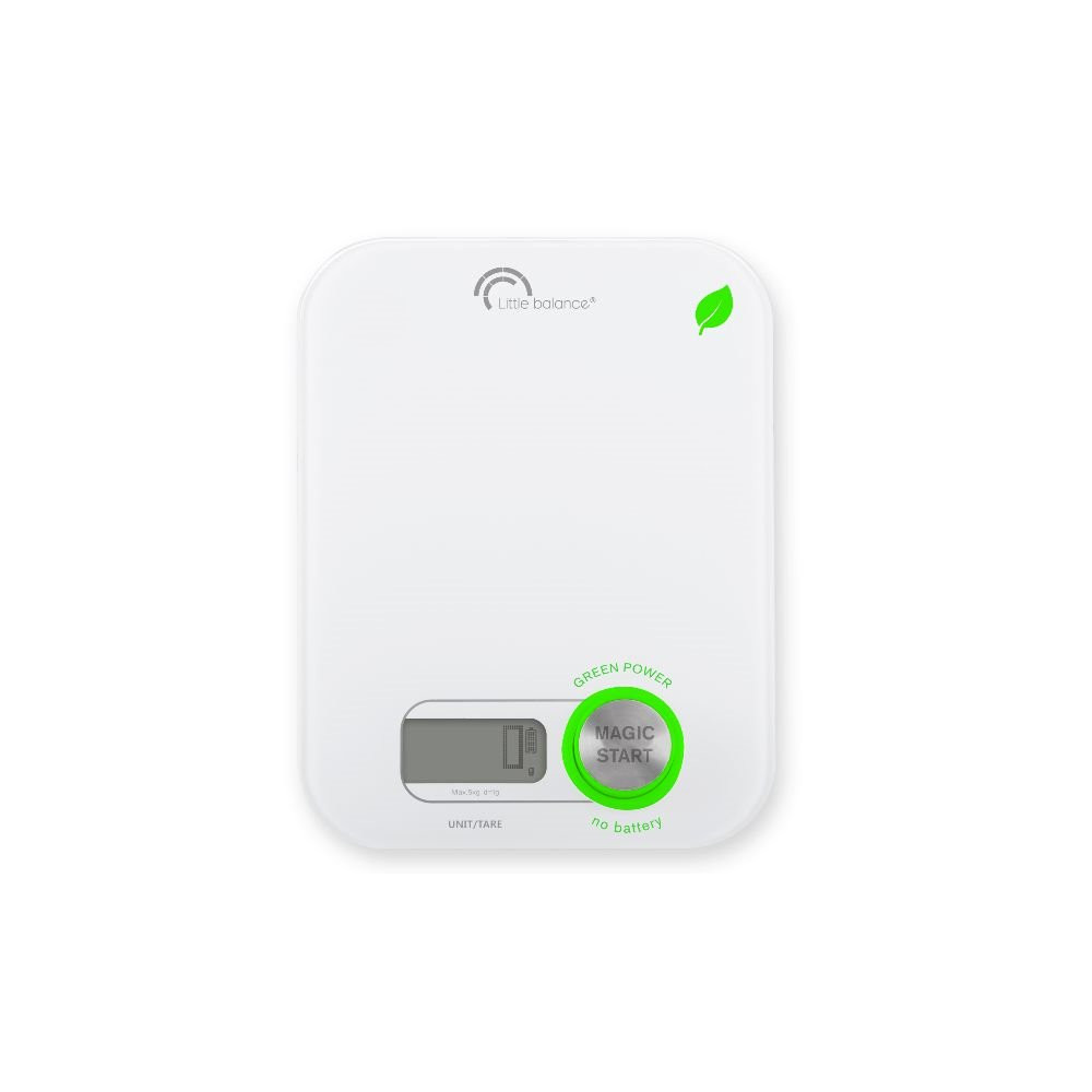 La balance culinaire Little Balance Green Power 8198 coloris blanc marque un tournant dans l'équipement de cuisine connecté à l'écologie. Grâce à sa technologie exclusive Magic-Start, une simple rotation du bouton dédié suffit à générer l'énergie nécessaire pour une pesée complète : plus jamais besoin de pile, ni de batterie à recharger.