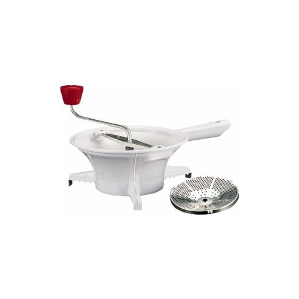 Son format grand modèle (GM) le destine aux cuisines familiales ou à ceux qui aiment préparer leurs repas en grande quantité pour gagner du temps en semaine. Le corps en plastique alimentaire résistant allège l'ensemble par rapport aux versions métalliques, tout en conservant une bonne tenue lors du passage des aliments. Les poignées ergonomiques facilitent la manipulation même lorsque le moulin est chargé.