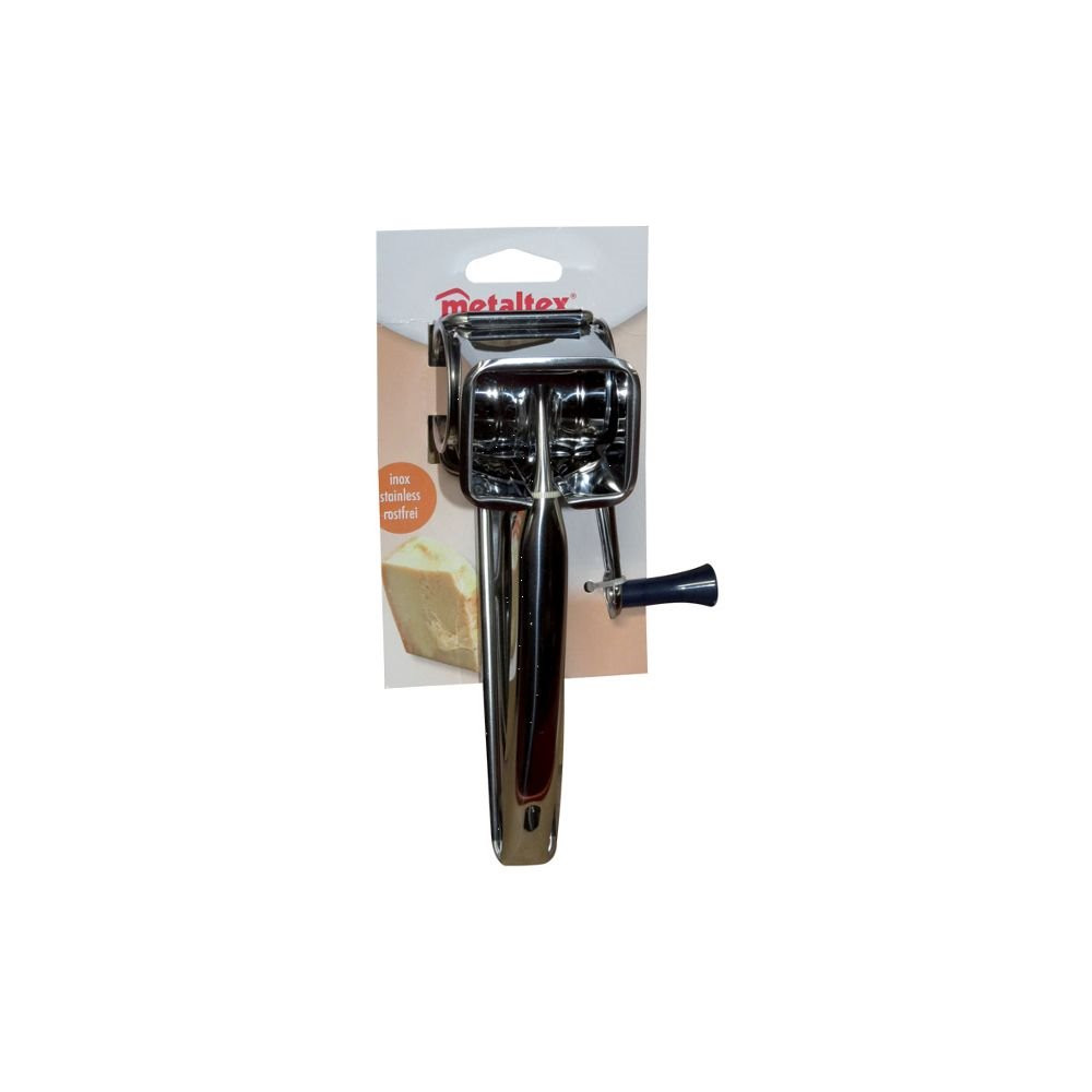 Son fonctionnement repose sur un mécanisme à manivelle intuitif qui permet de râper le fromage en quelques tours de poignet, sans forcer. La râpe peut s'utiliser directement au-dessus des plats — gratins, pizzas, pâtes, salades — pour doser précisément la quantité souhaitée. La structure en inox intégral évite tout risque de rouille et facilite l'entretien.