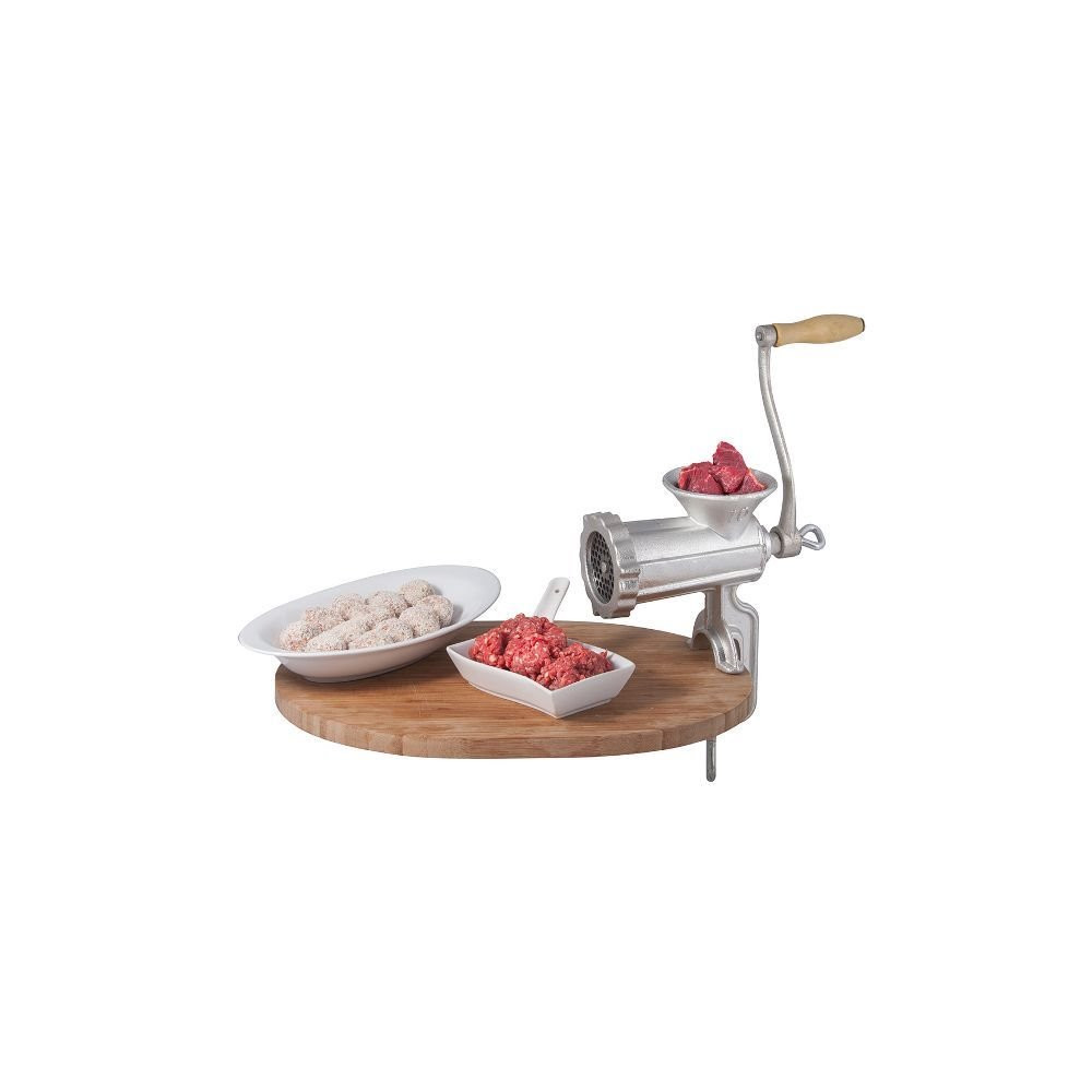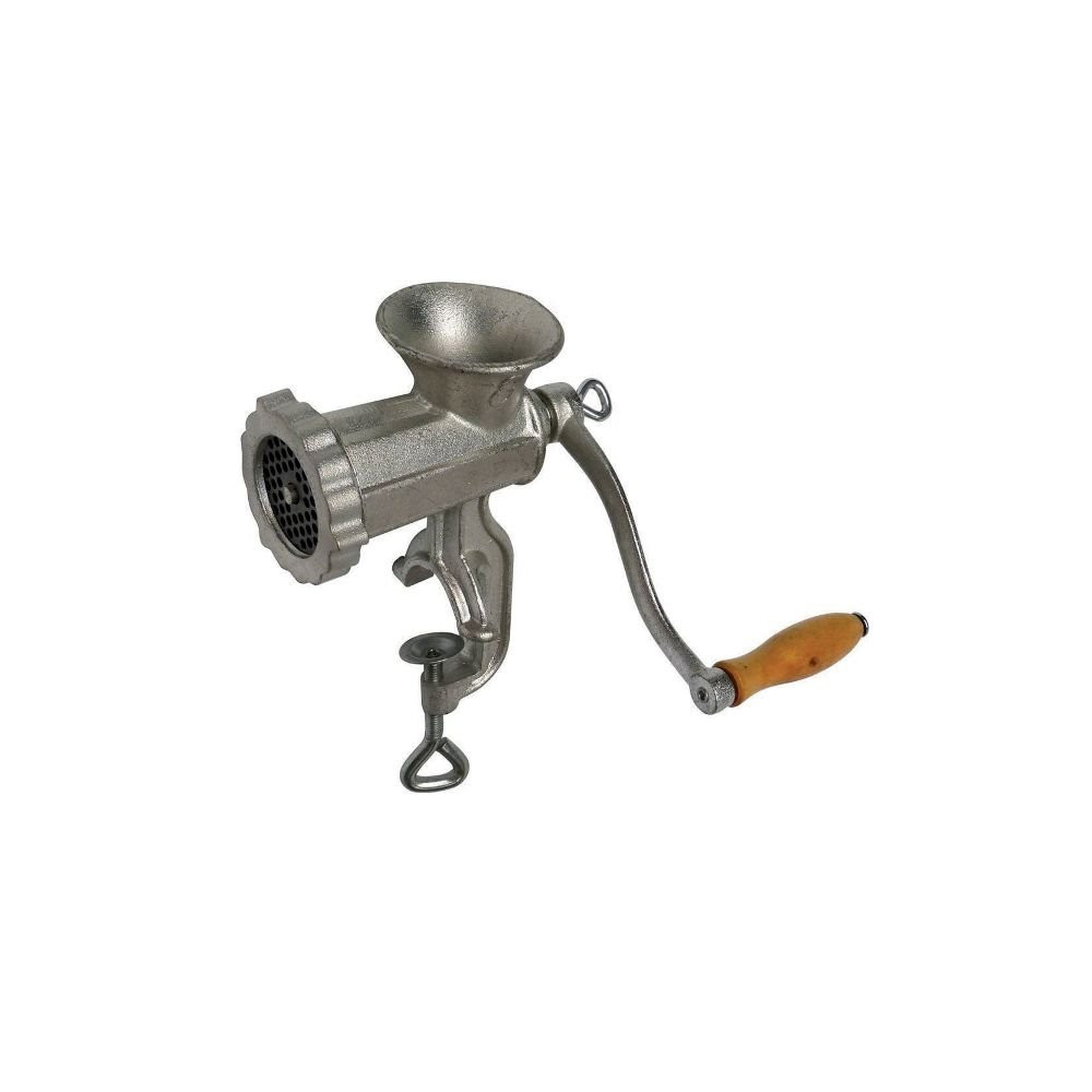 Entièrement réalisé en fonte étamée, ce hachoir est à la fois solide, durable et conforme aux exigences alimentaires. Sa vis de serrage assure une fixation ferme sur le bord du plan de travail, garantissant stabilité et sécurité durant le hachage. Il est livré de série avec un couteau et une grille de 4,5 mm pour un hachage net et homogène dès la première utilisation.