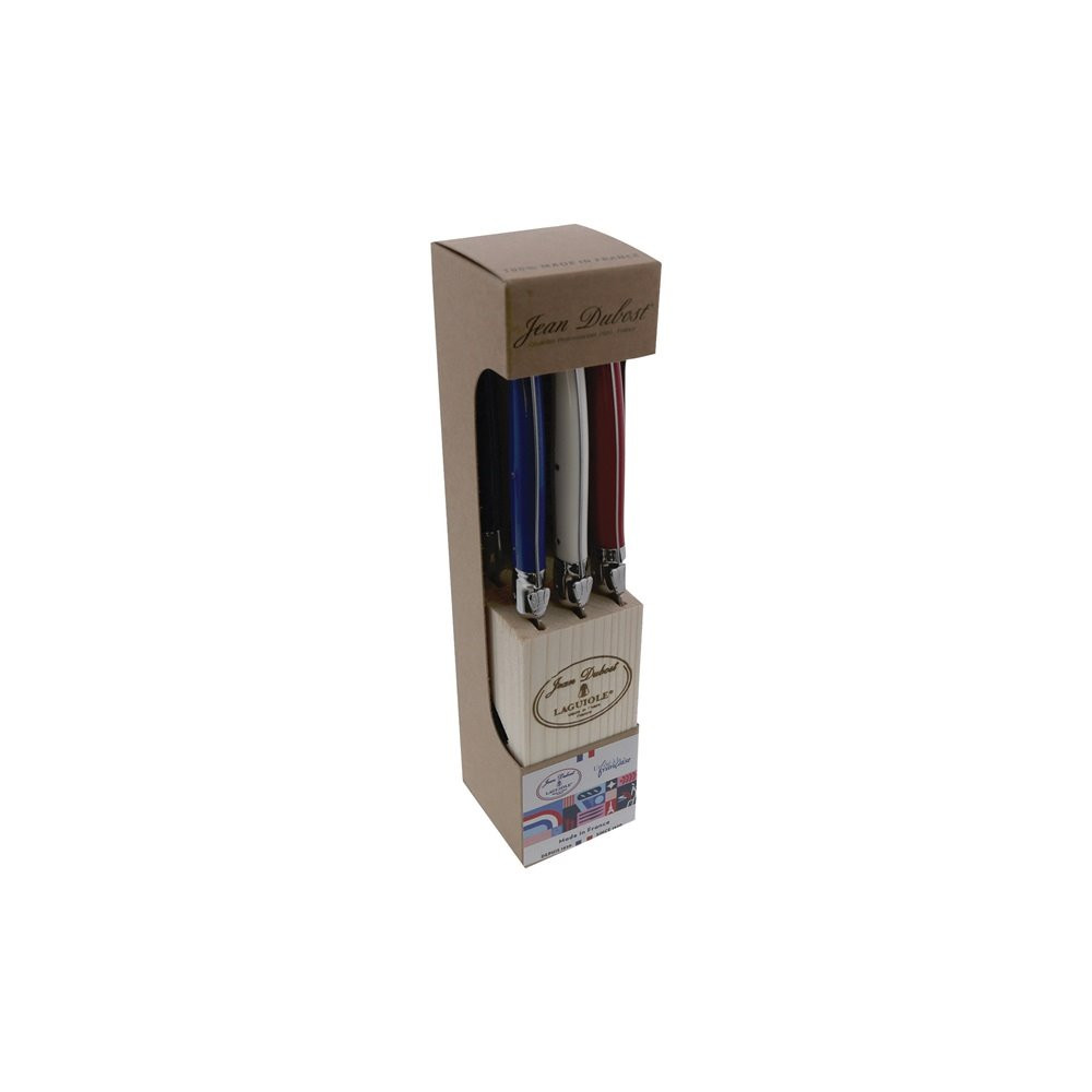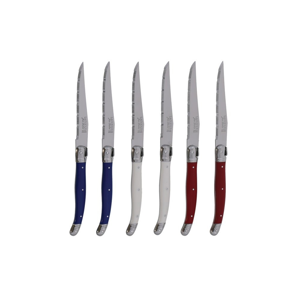 Bloc 6 couteaux à steak Laguiole - Un été à la Française - Cette année, devant les JO Paris 2024,cuisinez en bleu, blanc, rouge ! - Défendez les couleurs de la France avec ce bloc comprenant 6 couteaux à steak Laguiole 100% made in France ! - Au service de vos moments gourmands autour des JO Paris 2024 et autres évènements sportifs ! - Lame inox large et robuste, finition satinée - Lame micro-dentée en acier inox trempé - Épaisseur 1.2 mm - Manche plastique ABS aux coloris assortis : bleu, natur