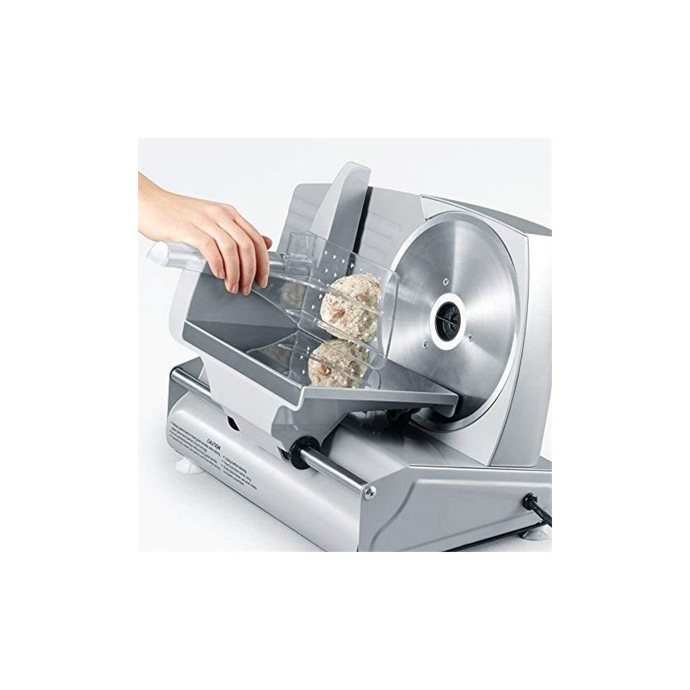 Le boîtier moteur, la plaque de butée et la base sont réalisés en métal robuste, assurant stabilité et longévité. La lame en acier inoxydable de 19 cm de diamètre est amovible pour faciliter le nettoyage. Le réglage précis de l'épaisseur de coupe de 0 à 15 mm vous permet d'obtenir des tranches aussi fines que du carpaccio ou aussi épaisses que des rondelles généreuses, selon vos envies.