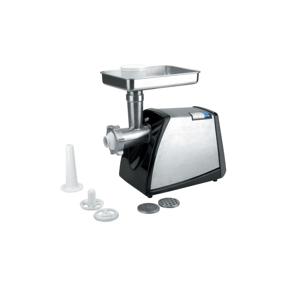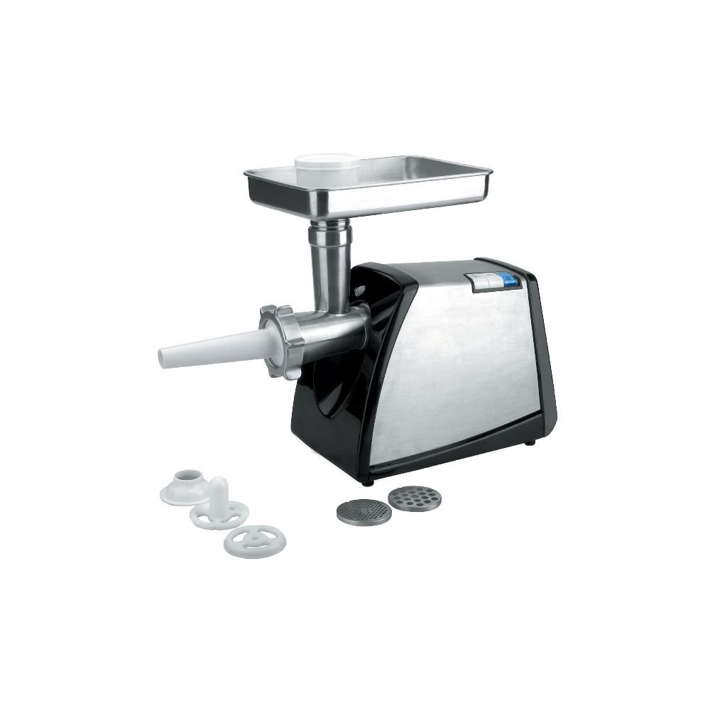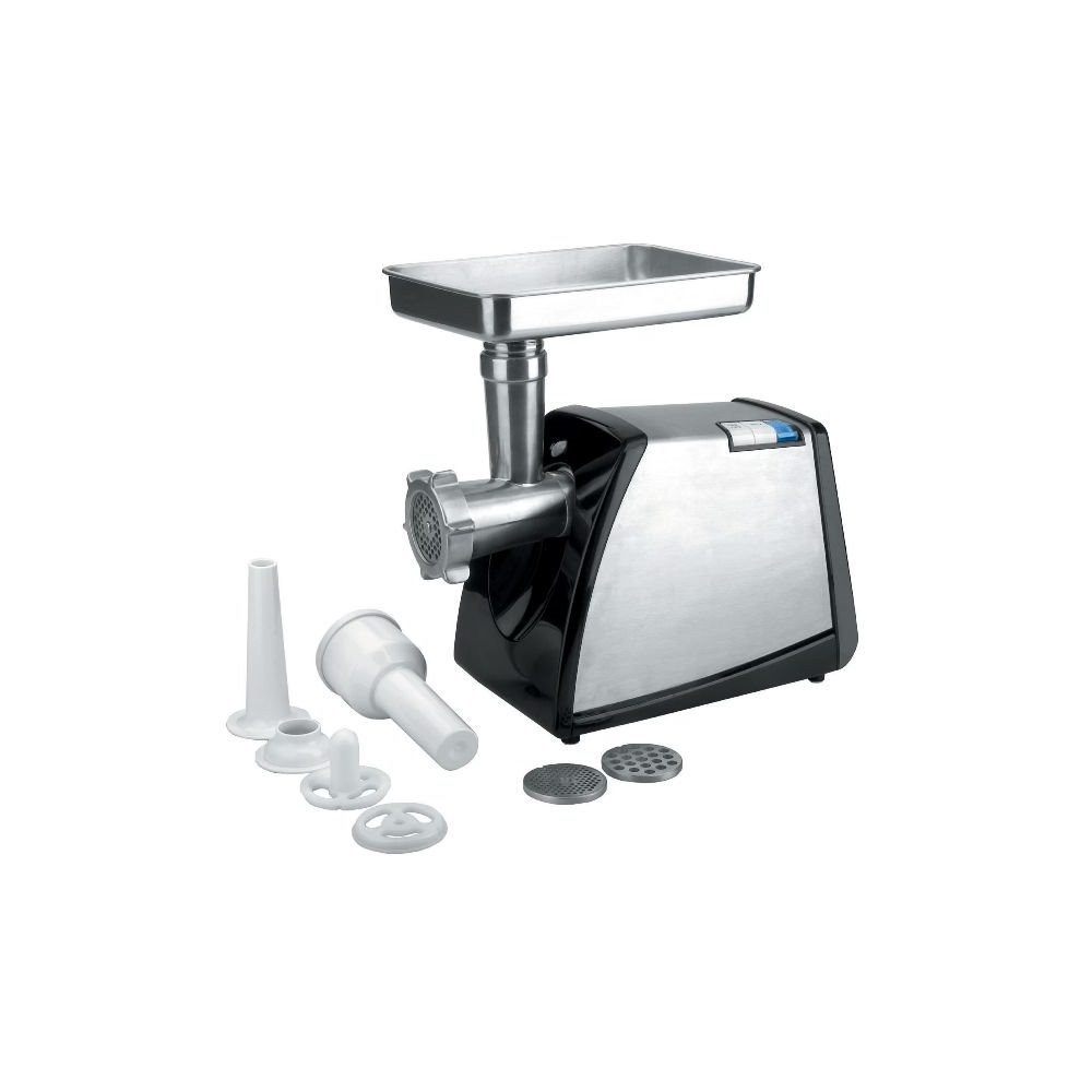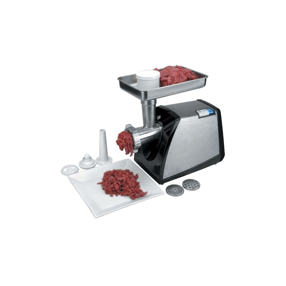Hachoir à viande électrique - Pour préparer viande et charcuterie - Pour hacher les légumes et la viande désossée, non congelés, pour la fabrication de charcuterie ou autres plats - 60 kg/h - Tête du hachoir en métal - Plateau en acier inoxydable - Couteau auto-affûtable - Une seule vitesse - Bouton marche arrière en cas de bourrage - Accessoires : 3 grilles en acier (3, 5 et 8 mm), un tube à saucisse, une tête de hachoir, un plateau et un poussoir - Bouton marche-arrêt avec voyant lumineux - Co