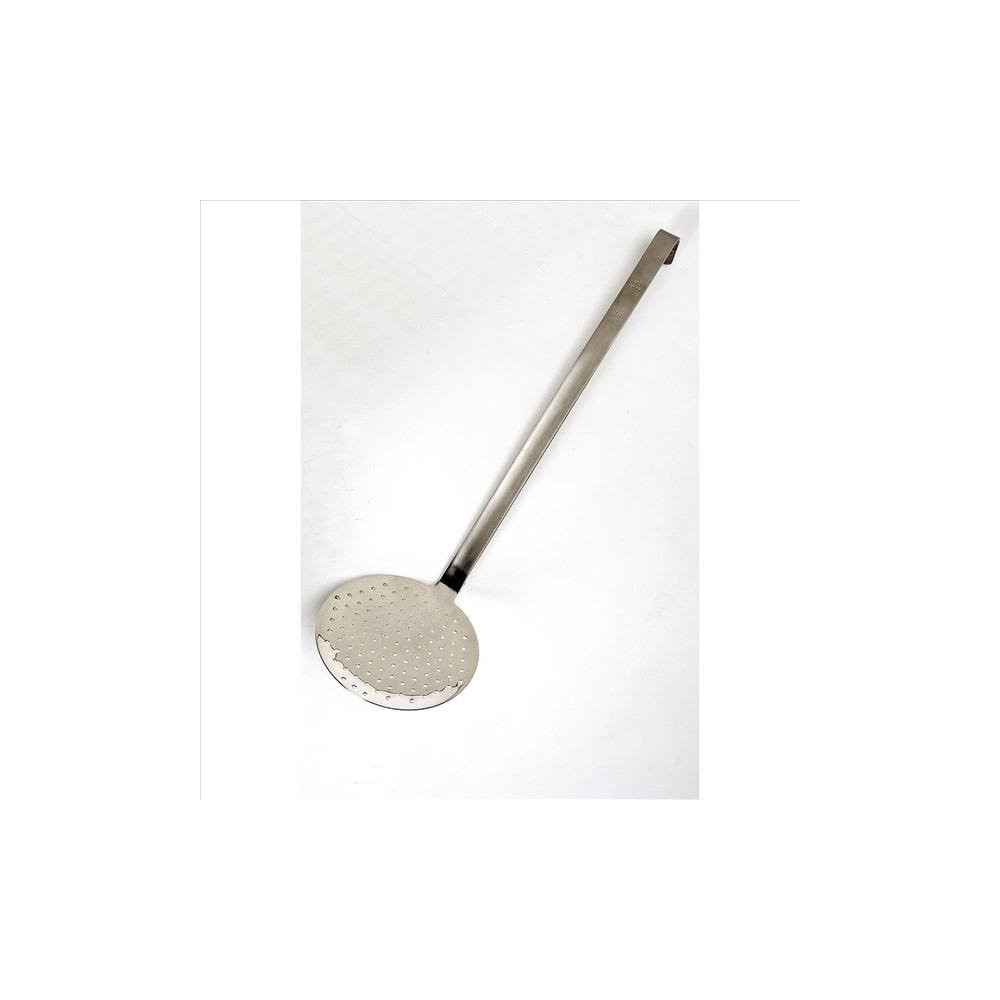 Avec son diamètre de 12 cm, cette écumoire propose un format compact parfaitement adapté aux petites casseroles, poêles profondes ou sauteuses. Le manche et la tête sont réalisés d'une seule pièce en inox, ce qui supprime tout risque de décrochage ou d'accumulation de résidus alimentaires aux jonctions — un gage de longévité et de facilité d'entretien.