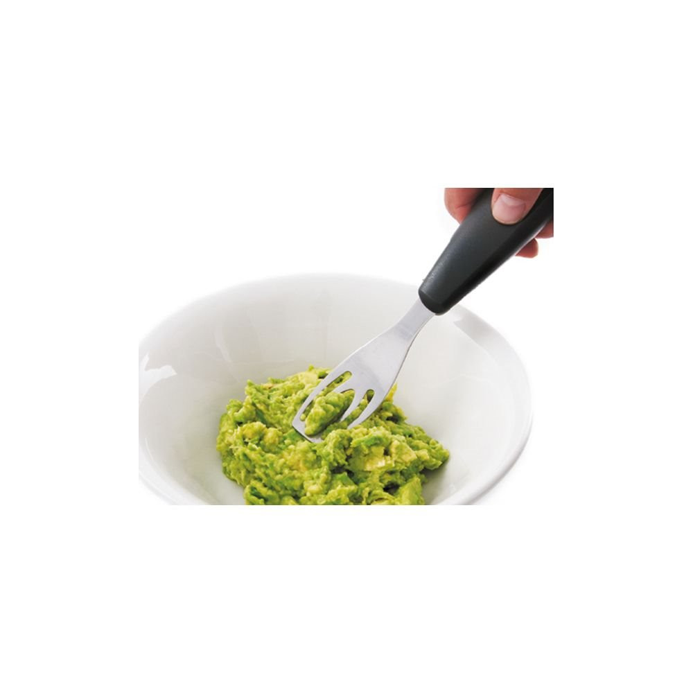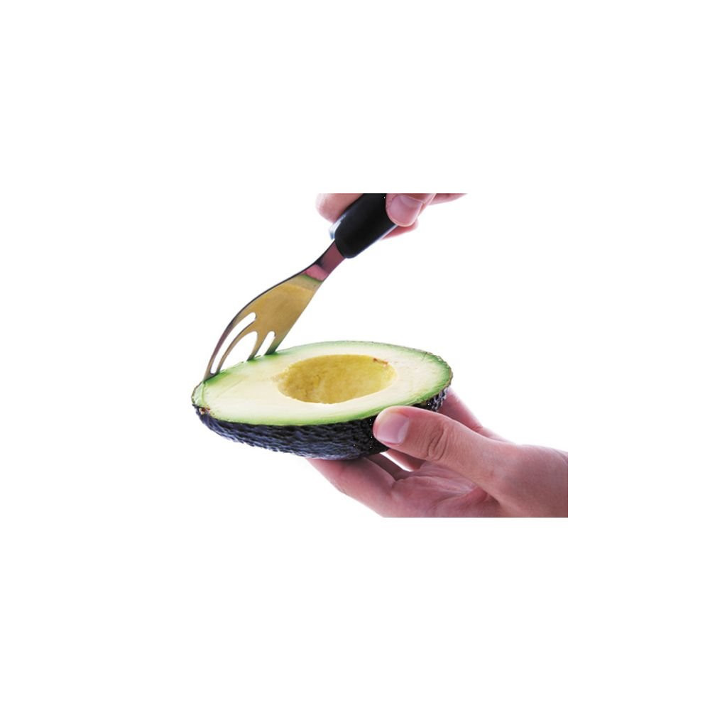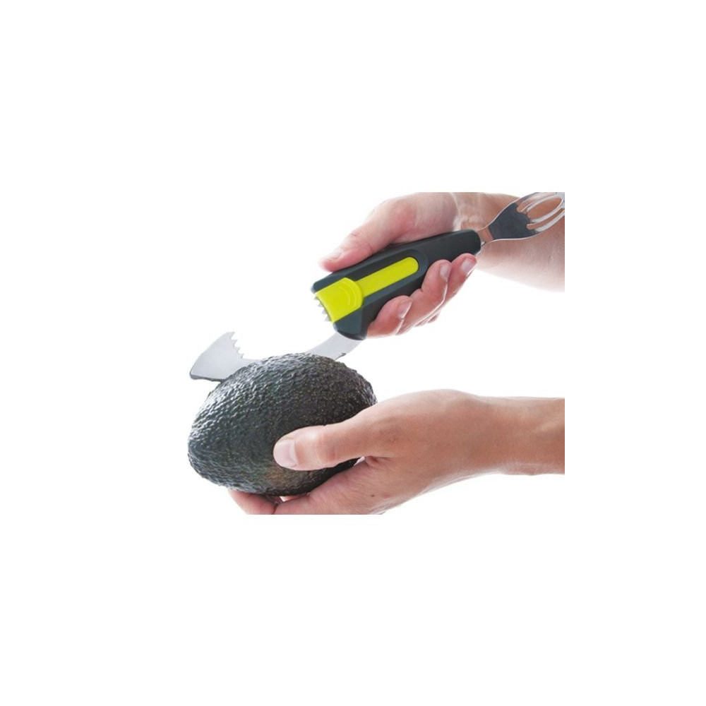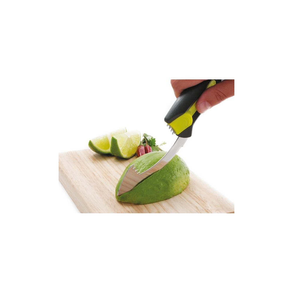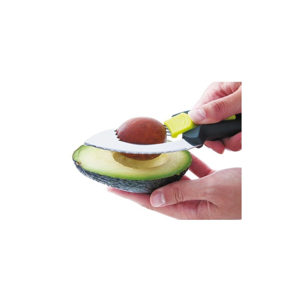 Sa conception multi-fonctions lui permet de réaliser 5 actions distinctes : couper l'avocat en deux grâce à sa lame incurvée protégée, dénoyauter sans risque, peler facilement la peau, trancher ou découper la chair en lamelles régulières. Chaque partie de l'outil est pensée pour s'adapter à la morphologie naturelle du fruit et garantir un résultat net à chaque utilisation.