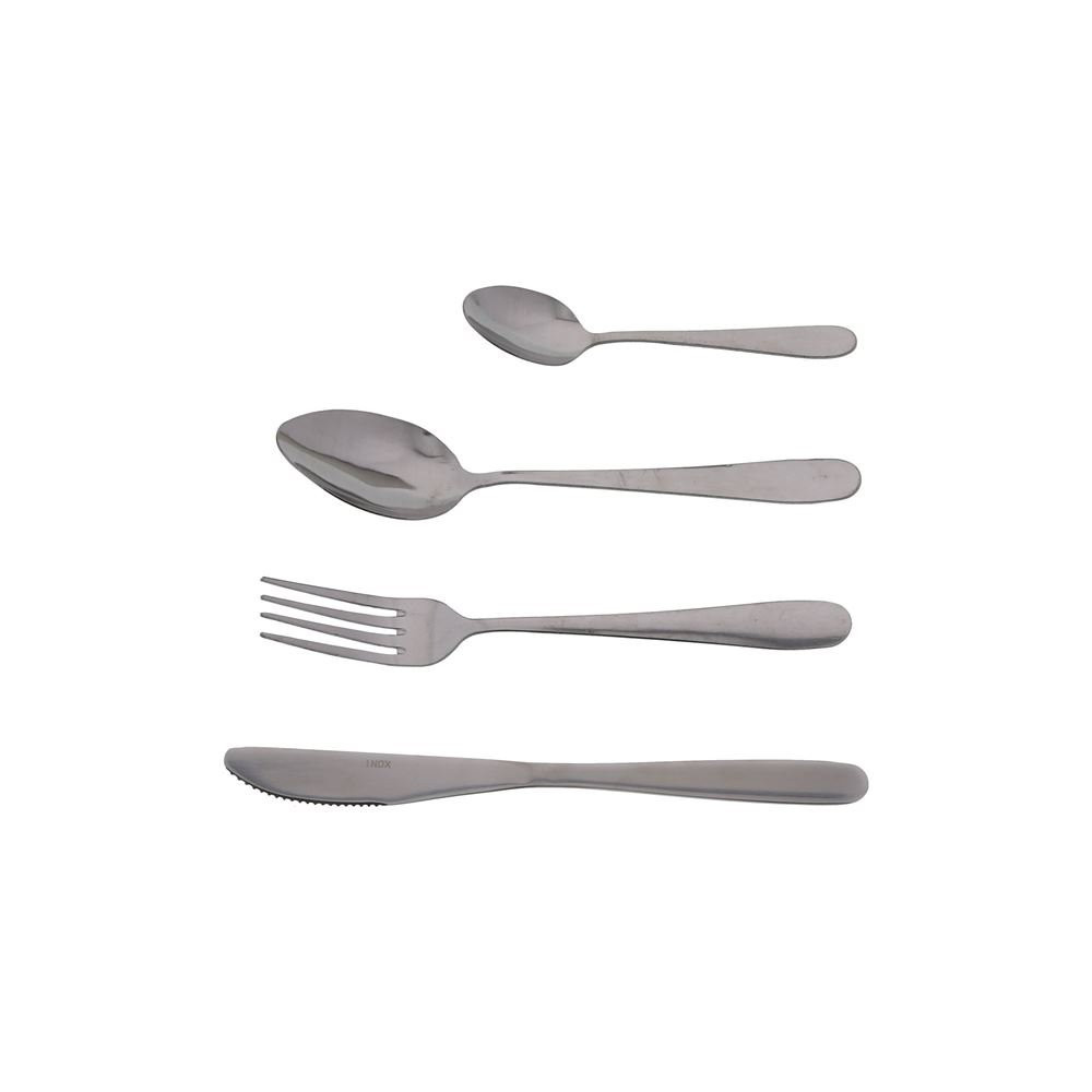 La ménagère se compose de 6 couteaux monoblocs, 6 fourchettes, 6 cuillères de table et 6 cuillères à café, soit de quoi couvrir une tablée de 6 personnes en totalité. L'ensemble est réalisé en inox de qualité, matériau reconnu pour sa durabilité, sa résistance à la corrosion et sa facilité d'entretien. La finition soignée des pièces leur confère un aspect brillant flatteur.