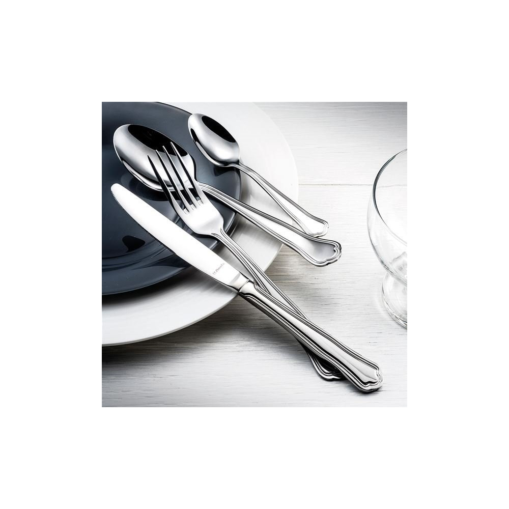 La cuillère de table Contour Urfé d'AMEFA allie élégance classique et sobriété contemporaine. Sa silhouette élancée est mise en valeur par un double contour graphique qui lui confère un caractère distinctif, aussi bien sur une table du quotidien que lors d'un repas plus soigné.