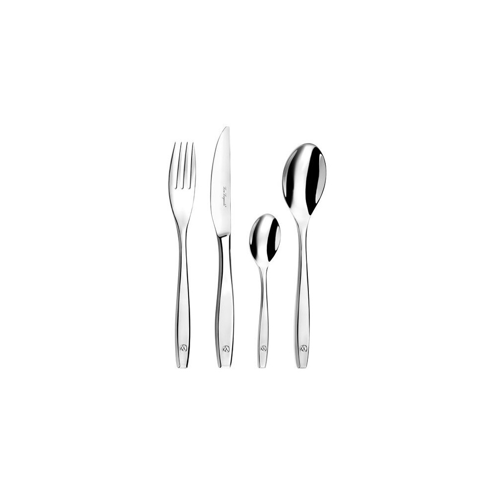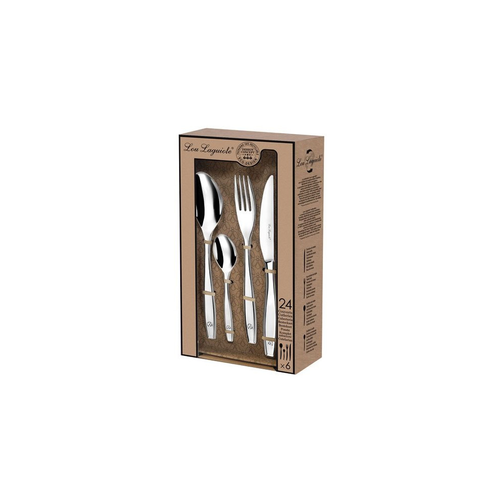 Chaque couvert de la collection Figure arbore le célèbre poinçon de l'abeille, emblème de la tradition laguiole revisité dans un graphisme moderne et stylisé. L'ensemble comprend 24 pièces en inox de qualité, conçues pour résister dans le temps tout en conservant leur éclat.