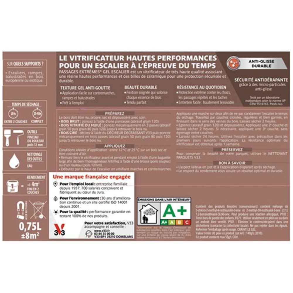 Escaliers, couloirs à fort trafic, paliers : le vitrificateur passages extrêmes V33 incolore finition satin en format 0,75 L a été conçu pour répondre aux exigences les plus élevées en matière de résistance. Son association unique d'une résine haute performance et de billes de céramique microscopiques lui confère une protection exceptionnelle contre les agressions mécaniques répétées.