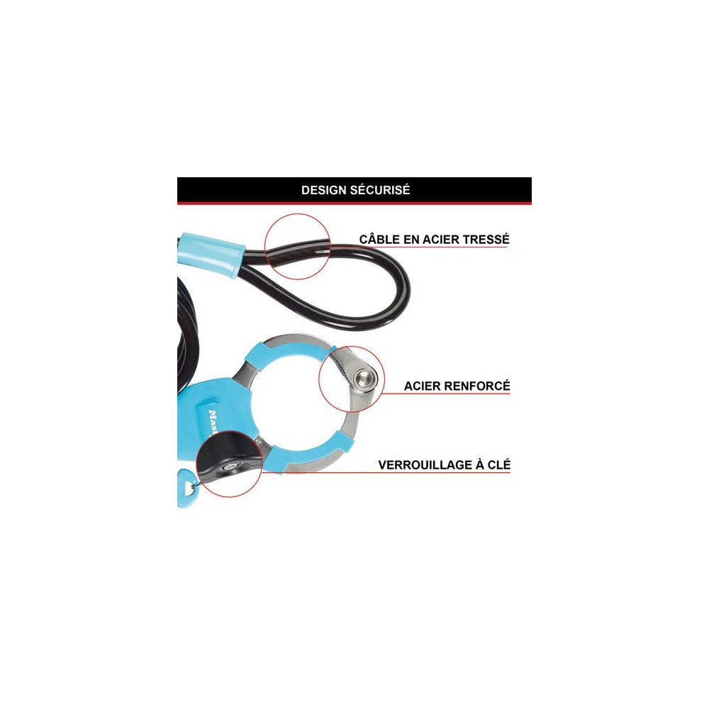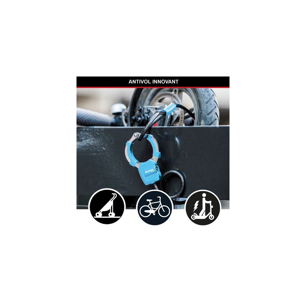 Sécuriser un vélo, une trottinette ou une poussette en quelques secondes et sans contrainte, c'est ce que propose le câble antivol à clé avec menotte MASTER LOCK – 1 mètre. Robuste, discret et polyvalent, ce câble bleu est un indispensable du quotidien pour tous les utilisateurs de mobilité douce.