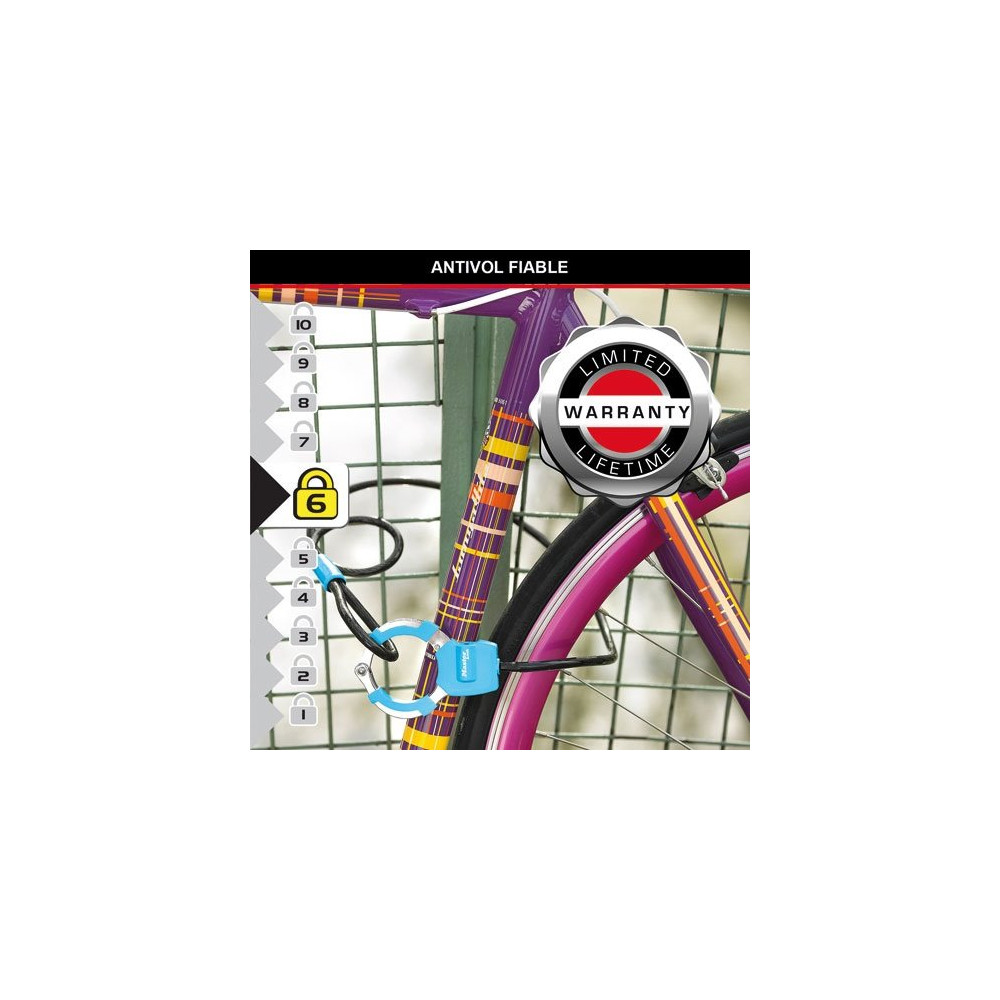D'une longueur de 1 mètre, ce câble offre une amplitude suffisante pour attacher votre équipement à un poteau, une rambarde ou tout autre point fixe. La menotte intégrée se fixe directement au cadre du vélo ou à la roue, tandis que le système de verrouillage à clé garantit une ouverture simple et sécurisée. Sa conception en câble acier tressé résiste aux tentatives de coupure du quotidien.