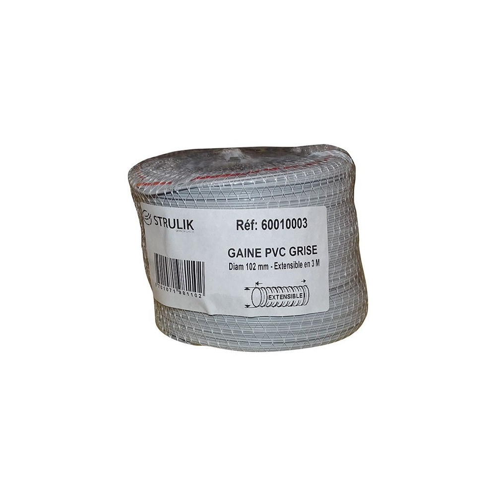 La gaine souple PVC STRULIK diamètre 100 mm en 3 mètres sous filet est la solution pratique et économique pour la mise en place ou l'extension d'un réseau de ventilation résidentiel. Composée d'une paroi en PVC gris enveloppant une armature hélicoïdale en fil d'acier, elle associe souplesse d'installation et bonne résistance mécanique.